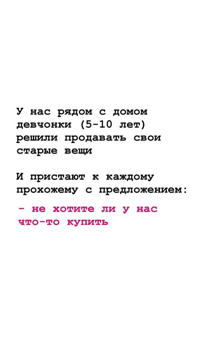 У нас во дворе дети решили заработать денег И уже недели две (а может и больше) идут серьёзные торговые процессы: кто-то продаёт старые игрушки и книги, кто-то делает сам вязаные игрушки и фенечки. Цены — от 10 до 100 рублей. Кто-то зарабатывает 100–200 руб., а кто-то и 1000 за день. Есть даже перевод по карте — не только наличка)))) И вроде бы всё классно — дети заняты, создают, общаются, учатся, но… Каждый раз, когда я прохожу мимо, они говорят: «А не хотите ли у нас что-нибудь купить?» И тут сразу же ответ: нет, не хочу. Хочется пройти мимо. Я долго не могла понять, в чём тут причина. И вот только сегодня поняла: ⠀ 👉 эта фраза не цепляет, не вовлекает, а сразу ставит человека в позицию "отказаться" Даже если что-то симпатичное — энергетика не та. Не хочется ничего рассматривать, не хочется улыбаться, хочется поскорее сбежать. Хотя идея — крутая. Дети делают серьёзную работу. Стоят сосредоточенные, смотрят как взрослые. В глазах мелькают только рубли. Но не хватает самого главно