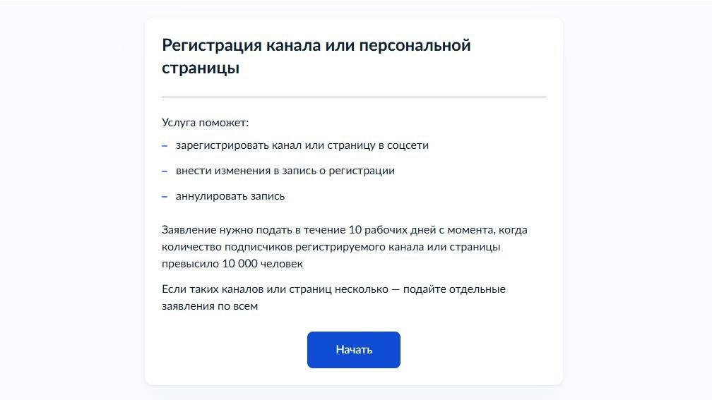 При наличии у предпринимателя канала или страницы в следующих социальных сетях с количеством подписчиков более 10 000 пользователей ему требуется направить заявление Федеральную службу по надзору в сфере связи, информационных технологий и массовых коммуникаций (Роскомнадзор): Likee LiveJournal Pinterest Rutube Telegram TikTok Twitch Yappy YouTube ВКонтакте Дзен Одноклассники Пикабу Заявление направляется через Госуслуги. Подробнее у нас на официальном сайте https://law115.ru/registraciya-stranic-i-kanalov-v-socialnyh-setyah-v-rkm