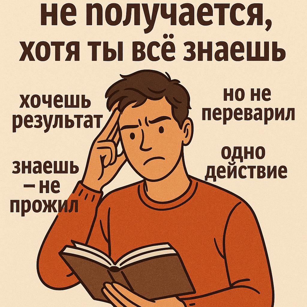 Ты уже всё прочитал. Ты знаешь про 21 день на привычку, про силу «маленьких шагов», про «встань в 5 утра». Но что-то меняется? 🤔 Честно — нет. Ты как будто знаешь всё, но не живёшь этим. Почему так? Вот 5 причин, почему между знанием и действием часто лежит пропасть: 1. Ты знаешь — но не прожил 🧠 → 🧍♂️ Знание без опыта — просто контент. Ты можешь знать, как тренироваться, но пока не почувствуешь мышечную боль — это не твоё. Пример: ты читал про дыхание от тревоги. Но в момент стресса ты не дышишь — ты срываешься. Пока не прожил телом — не закрепится. 2. Ты потребляешь, но не перевариваешь 📚⚡️ Ты читаешь, смотришь, слушаешь. Много. Но не даёшь себе паузы, чтобы осмыслить и применить. Пример: после книги — ни вывода, ни практики. Просто следующий пост, следующий ролик. 3. Ты хочешь результат, а не процесс 🎯 Знание вдохновляет. Действие — утомляет. Ты хочешь «уметь», но не хочешь делать скучные шаги. Пример: ты завёл дневник. Один пропущенный день — и всё. А привычка — это