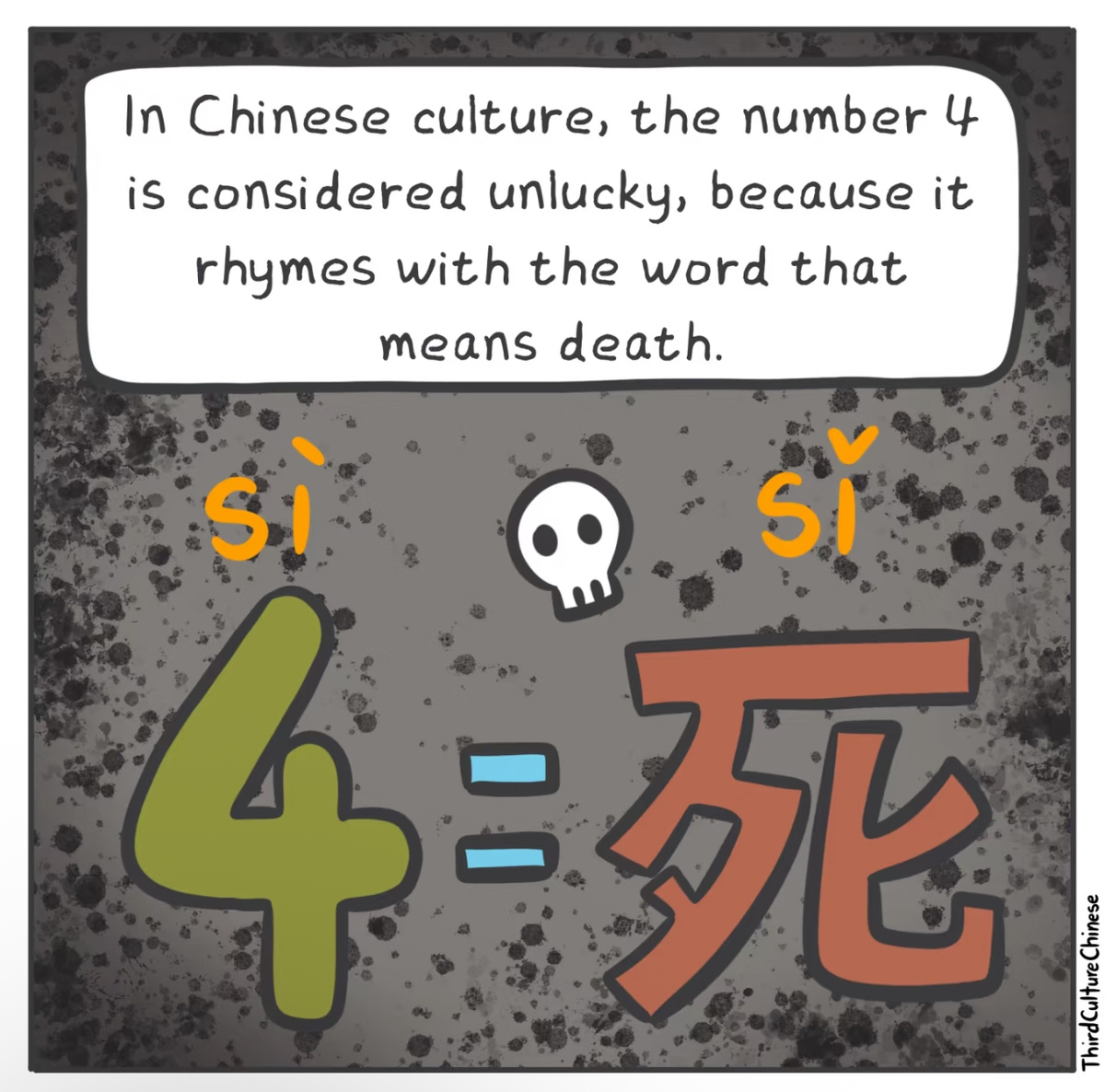 - Число 4 по-китайски произносится как sì (四) — почти так же, как слово sǐ (死), что значит «смерть». Из-за этого сходства китайцы избегают этого числа в номерах квартир, гостиничных этажах, автомобильных номерах и даже телефонных комбинациях. В лифтах китайских многоэтажек часто отсутствует 4-й этаж — его заменяют буквами, вроде 3А.