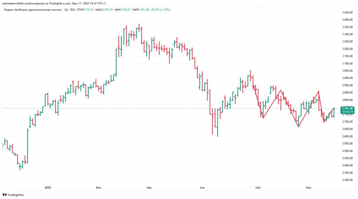 ❗️17 июня российский фондовый рынок показал рост, индекс МосБиржи укрепился на 1,87% до уровня 2788,94.