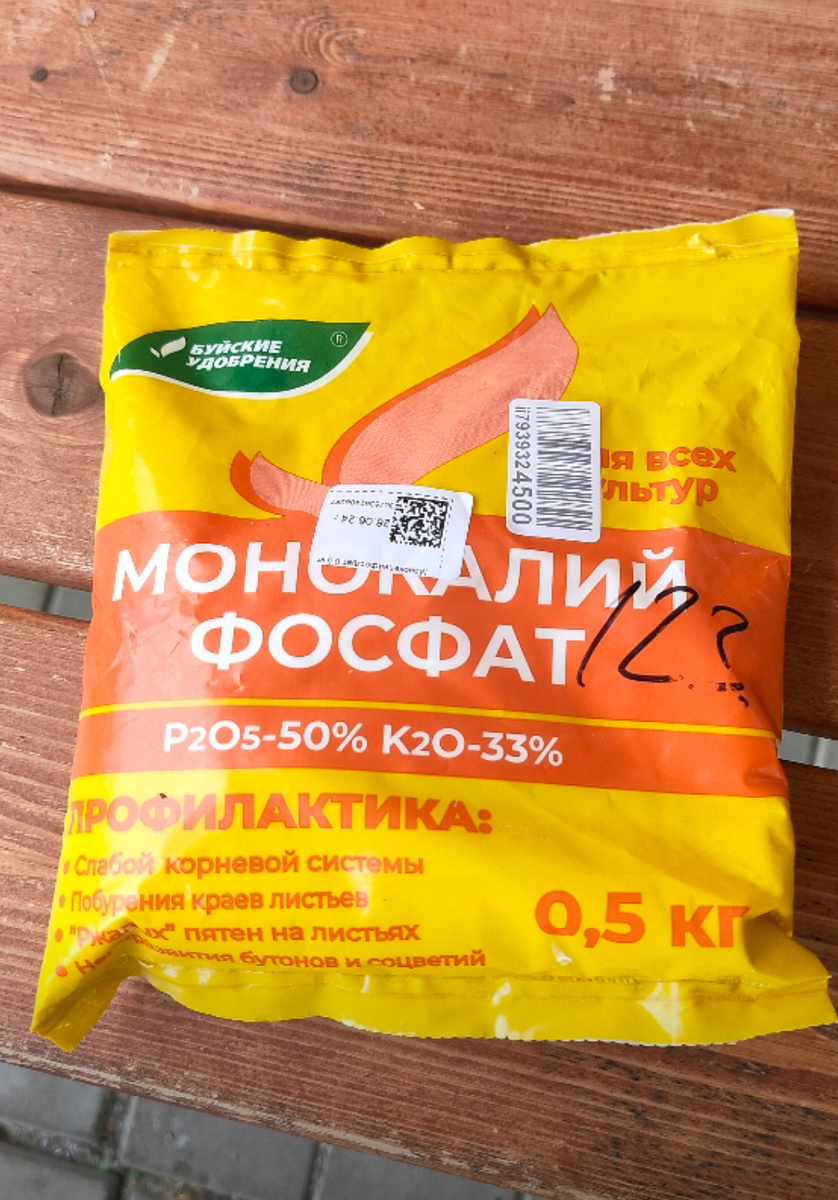 Монокалий фосфат (монофосфат калия) — это высокоэффективное водорастворимое фосфорно-калийное удобрение. В составе около 50% фосфора и 33% калия.