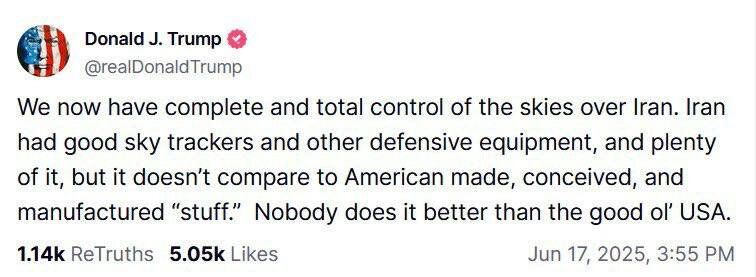 Трамп заявил, что воздушное пространство над Ираном теперь находится под полным контролем США У Ирана были хорошие локаторы и другое оборонительное оборудование, и их было предостаточно, но они не идут ни в какое сравнение со «штучками» американского производства. Никто не делает это лучше, чем старые добрые США — написал Трамп в Truth Social. Заря | Новости - Подписаться