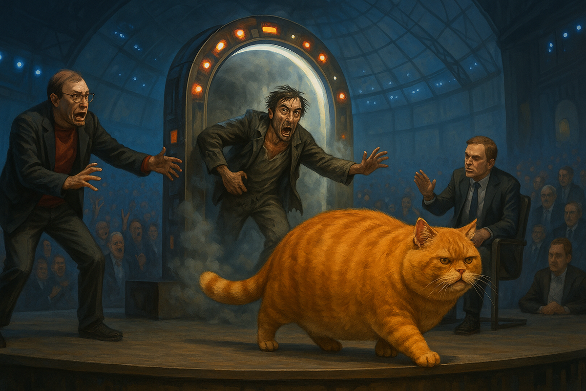 Проследив за взглядом пришельца, люди увидели толстого рыжего кота с недовольной мордой, который, деловито зевнув, направился к сцене.