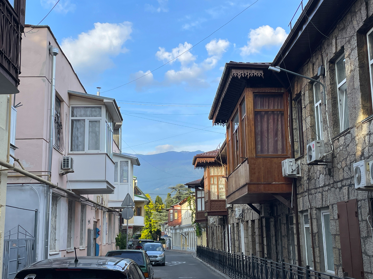 Сейчас покажу, как живут простые люди в 600 метрах от моря и примерно 7-10 минут неспешного шага. Обычные дома с выступающими деревянными балкончиками, но вся прелесть в их декоративности, где ажурное обрамление является главным украшением и вносит колорит всей улице.