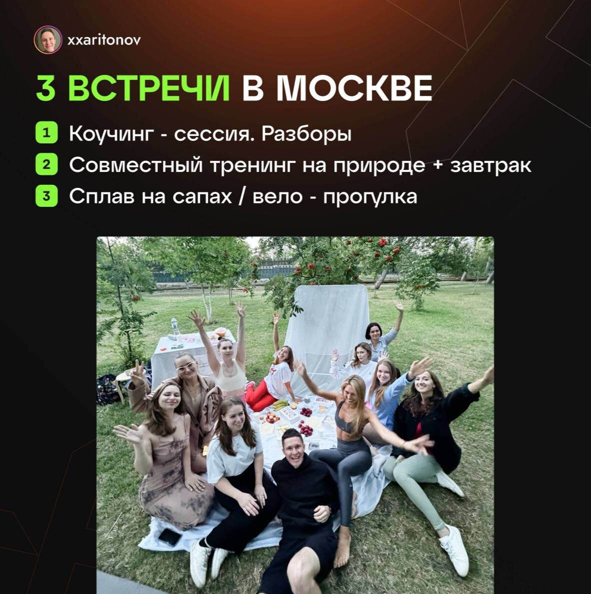 Встречи в Москве! 🥳 Решил их сделать и на втором тарифе Ресурса! Чуть скромнее, но.. 1) Организуем с вами 5 часовой нетворк - пикник на тему Реализации потенциала. Проработаем ваши проблемы, страхи, блоки, ошибки и убеждения. 2) Вырвемся на вело прогулку или сапы! Круто отдохнем на природе и зарядимся по полной! Думаю, будет очень весело! Особенно, если учитывать, что у нас там уже, одни девочки 😂, такое я люблю!