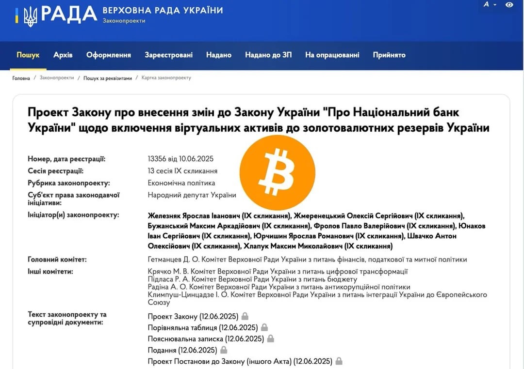 Украина может включить Bitcoin в свои золотовалютные резервы. В Верховной Раде зарегистрирован законопроект №13356 от 10 июня 2025 года, предлагающий внести изменения в закон «О Национальном банке Украины» и официально признать виртуальные активы частью государственных резервов. Инициаторами законопроекта выступили восемь депутатов, включая Ярослава Железняка, Максима Бужанского и Павла Фролова. Законопроект уже передан на рассмотрение профильных комитетов по финансам, цифровой трансформации и антикоррупционной политике. Если документ будет принят, Украина станет одной из первых стран в Европе, которая официально добавит Bitcoin в свои резервы.