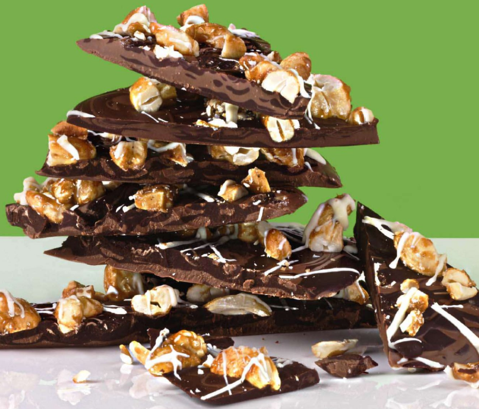 Время приготовления — 25 минут. 8 порций, Уровень сложности — лёгкий. Орехи можно использовать любые, на ваш вкус. Ингредиенты: - 100 граммов несолёных орехов кешью - щепотка молотого душистого перца - сливочное масло - щепотка морской соли в хлопьях - 1 столовая ложка кленового сиропа - 200 граммов молочного шоколада - 200 граммов тёмного шоколада - 25 граммов белого шоколада Нагрейте сковороду с антипригарным покрытием, положите на неё каштаны, кусочек масла, молотый душистый перец, соль и кленовый сироп. Поджаривайте, помешивая, пока орехи не станут золотистыми, затем высыпьте их на пергаментную бумагу и дайте остыть. Растопите молочный и тёмный шоколад отдельно. Немного охладите, затем вылейте сначала тёмный шоколад, затем молочный шоколад на маленький противень, выстланный пергаментом. Немного перемешайте. Очень грубо нарежьте кешью и разбросайте его по шоколаду. Остудите до застывания. Растопите белый шоколад и аккуратно полейте им сверху тонкими линиями. Охладите снова до застыв
