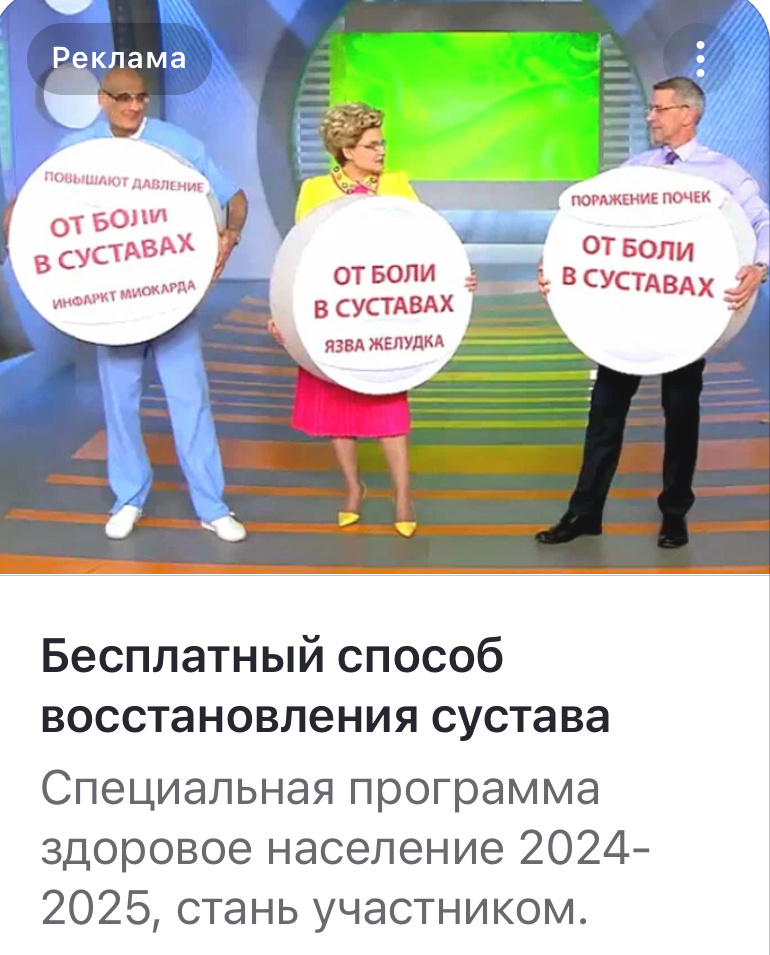 Так и сейчас: бесплатно, забирайте, и восстанавливайте свои суставы. Эффективно, и безопасно. Вопрос только один: если бесплатно, то зачем кто-то тратится на рекламу? Аттракцион невиданной щедрости?
