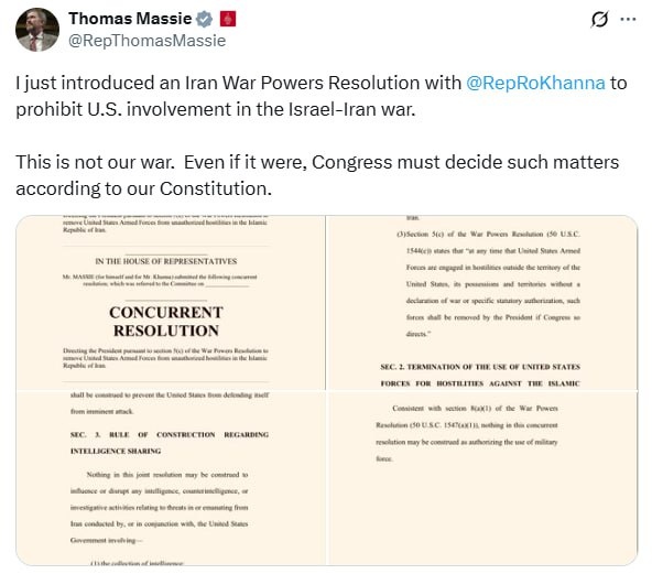 Rep. Massie introduces resolution to ‘prohibit US involvement in the Israel-Iran war’