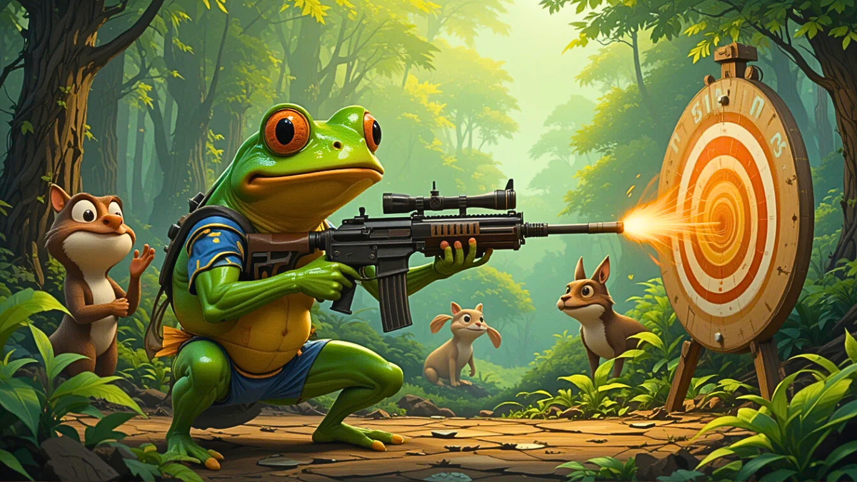 В одном лесу, за тремя пеньками и одним слегка кривым дубом, жил лягушонок по имени Жабер. Не просто жил — он тренировался! Пока другие лягушки прыгали в болоте и ква-кали песни, Жабер вставал до рассвета, надевал повязку на глаз (для крутизны), брал свой автомат на батарейках и стрелял по мишеням.
