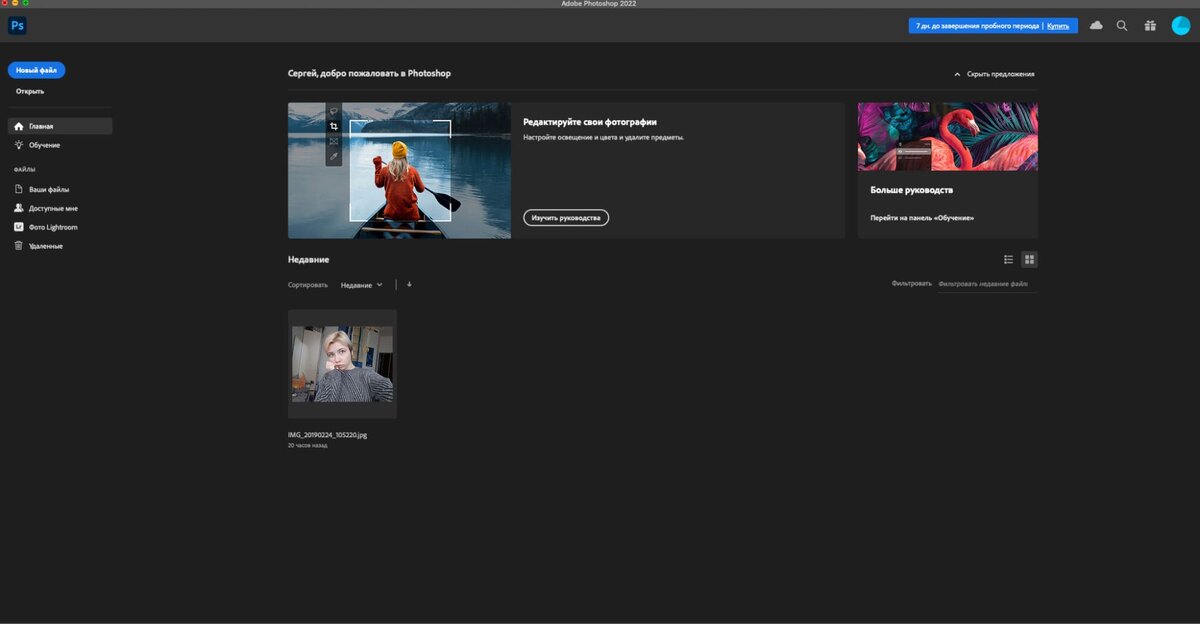 Хороший способ овладеть программой — сразу запустить какой-нибудь проект. Тогда навыки схватываются на «кончиках пальцев» по мере выполнения каждого конкретного действия. Более серьезно оттачивать мастерство помогут photoshop уроки, которых в большом количестве можно найти по запросам в сети.Поскольку в марте 2022 года компания Adobe официально покинула Россию, пункт про порядок покупки и стоимость лицензии мы пропустим. Но, полагаем, вы знаете, как обойти эту неприятную ситуацию.Сразу оговоримся, что новичкам лучше установить фотошоп на русском. Так легче будет понимать значение разных иконок и параметров. На популярный вопрос: «Сколько весит фотошоп?», ответим, что на разных ресурсах он весит по разному. Например, размер версии 24.0.0 для Mac OS достигал 2,2 Гб. Не самая маленькая программа, для фотошопа потребуется освободить место на диске.После установки и запуска перед вами появится окно, в котором отобразятся недавние проекты и шаблоны. Можно открыть один из них или создать новый.Нажмите кнопку «Новый файл».