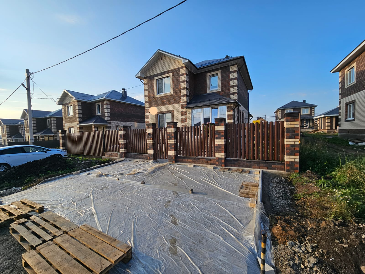Отмостки вокруг дома мы сделали в первый же год, и только в прошлом году залили перед домом бетонную парковку с прицелом на следующий сезон (то есть этот) укладывать брусчатку.