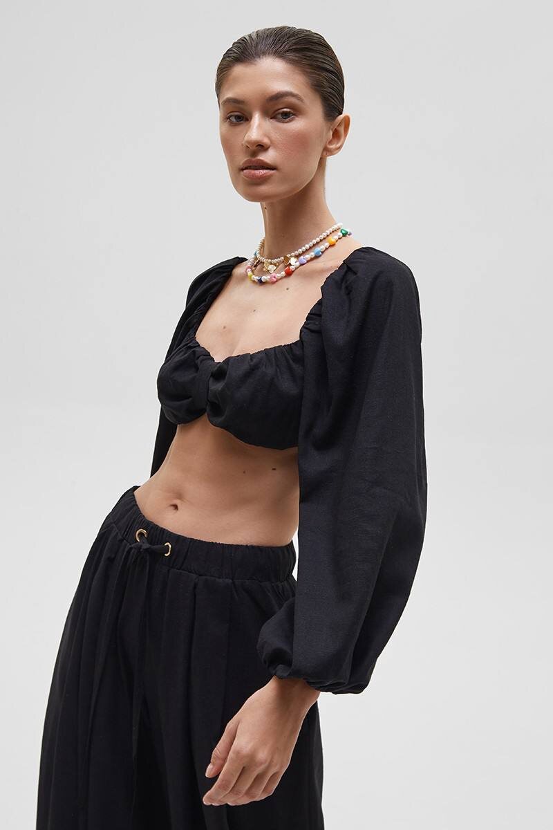 Экстремальной длинны топ с выразительным фигурным вырезом — модель, в которой эстетика сочетается с архитектурой силуэта. Пышные рукава-буфы придают образу театральную уравновешенность, а сборка на лифе делает акцент на пластике тела.