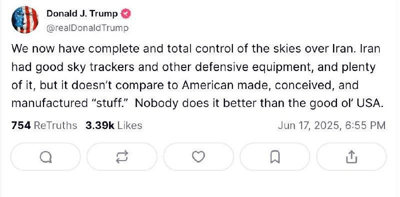 🇺🇸🇮🇷 Воздушное пространство над Ираном теперь находится под полным и тотальным контролем Соединенных Штатов