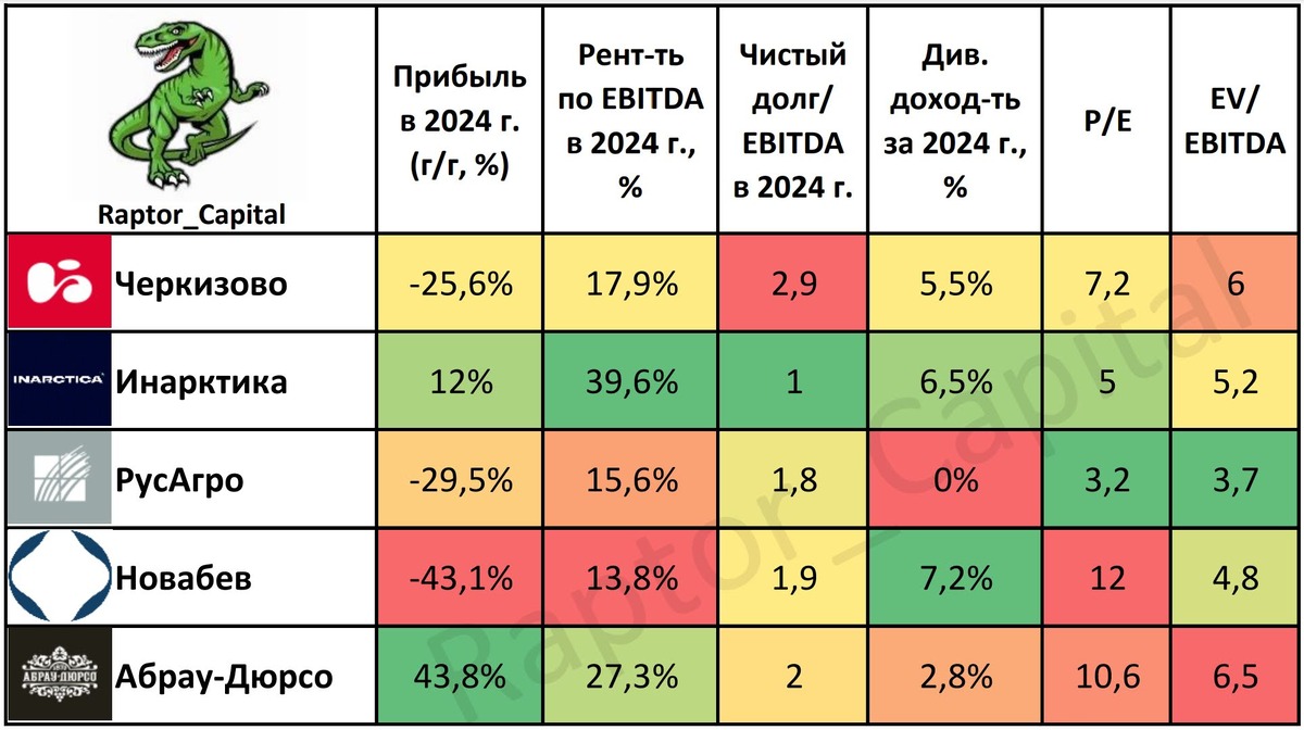 📌 И так, рубрика обзоров секторов Мосбиржи подходит к концу, и последний в очереди остался сектор пищевой промышленности. Напомню, ритейл я рассматривал отдельно. • Пищевая промышленность традиционно считается защитным сектором, ведь в условиях умеренной инфляции компании перекладывают её на потребителей, повышая цены на свою продукцию. • Но как показала практика, с высоким уровнем инфляции не справляется и пищевая промышленность. Большинство компаний не смогло поднять цены на продукцию так, чтобы они компенсировали рост цен на сырьё и оплату труда. Сюда же добавим закредитованность компаний при высокой ключевой ставке, итог – многие компании потеряли в прибыли по итогам 2024 года. • Ростом прибыли в 2024 году могут похвастаться только Абрау-Дюрсо (+43,8% год к году) и Инарктика (+12%). При этом, если брать нескорректированный показатель, то прибыль Инарктики снизилась в 2 раза. • Новабев (–43,1%), РусАгро (–29,5%) и Черкизово (–25,6%) не смогли переложить инфляцию на потребителей. •