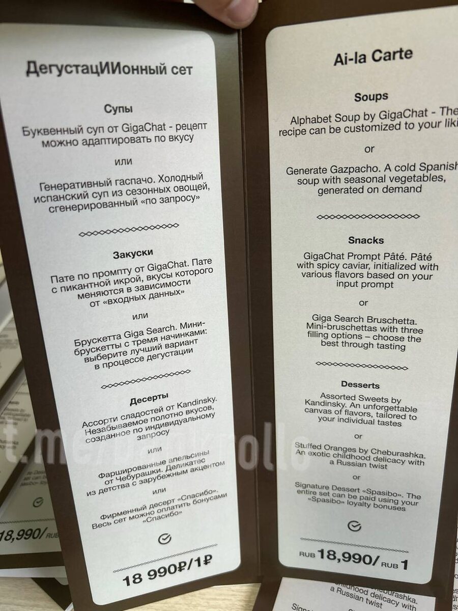 Участникам Петербургского международного экономического форума предложили попробовать блюда от ИИ. В сет входит «буквенный суп от GigaChat», «пате по промту» и даже «фаршированные апельсины от Чебурашки». Правда, такой обед обойдется почти в 19 тыс. руб. Но есть и хорошая новость – заказ можно оплатить бонусами «Спасибо».