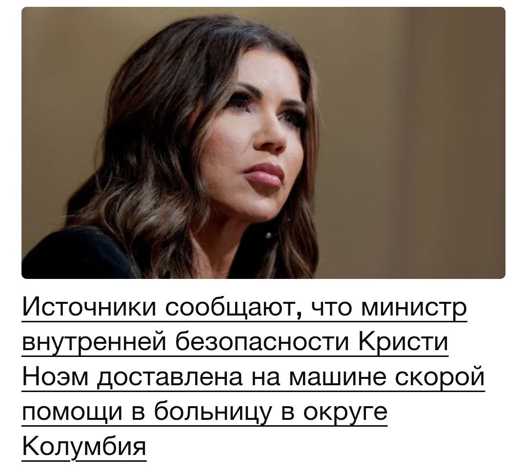 То Илона Маска проверяют на запрещённые химические вещества, то вот старушка министр внутренней безопасности навела шороху в СМИ своим состоянием организма. Ну оно и понятно, древняя же. Во вторник Кристи Ноэм, глава Минвнубезопасности США, устроила небольшой переполох. Не в зале заседаний, а в отделении неотложки одной из вашингтонских больниц. Причиной стала банальная, хоть и неприятная вещь – аллергическая реакция. Да-да, та самая Ноэм, которая обычно раздает указания по охране границ, сама потребовала срочной охраны… медицинской. Прибыла она туда с комфортом – на спецтранспорте, то бишь на скорой помощи. Ее пресс-служба, конечно, поспешила успокоить народ: "У госпожи секретаря случилась аллергическая реакция. Ее доставили в больницу из соображений предосторожности. Она в сознании и идет на поправку", – заявила Триша Маклафлин. Ох уж эти "соображения предосторожности"! Видимо, для высокопоставленных чиновников они включают целый кортеж агентов Секретной службы, торжественно дежу