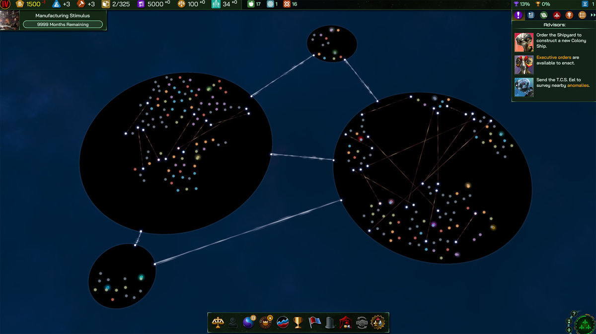 Генерация карт была полностью переработана. Звезды теперь корректно группируются в кластеры, вернулись созвездия из Galactic Civilizations II, а главной инновацией стали гиперпространственные пути между звездными системами.