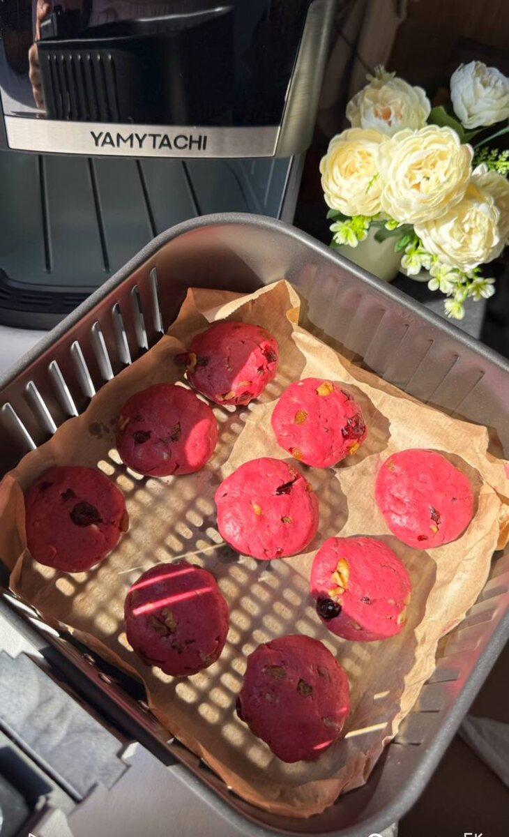 рецепт ⤵️ •свекла - 100 гр (1 шт среднего размера) •масло гхи - 60 Гр •овсянка - 90 гр ( измельчить в муку ) мука зеленой гречи - 50 гр ( можно взять рисовую, цельнозерновую) •разрыхлитель - 1/3 ч л •грецкие орешки - 50 гр •клюква, изюм - 50 гр Свеклу проварить и перебить в блендере. в миску отправить пюре свеклы, растопленное масло гхи, все сухие ингредиенты, орехи и изюм. Формируем печенье, получится 9 шт. Выпекаем в аэрогриле. Режим выпечка 15-20 минут. Аэрогриль артикул WB Арт #297015764