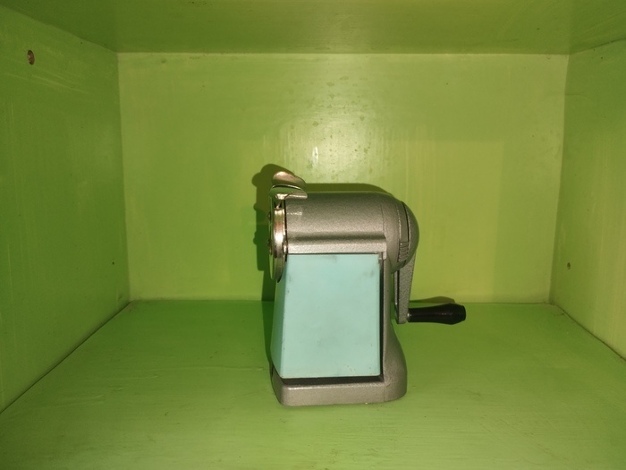 Сегодня расскажу о точилке для карандашей ШПР-164 сделанной в СССР. ШПР-164 выпускали на Владимирском заводе «Автоприбор», точилки выпускали до конца 80-х годов. Вид сбоку. Корпус металлический. Пластмасса в двух деталях, ручка и бункер для стружки. Корпус из алюминиевого сплава, фреза сделана из стали. Вид сзади. Зажим я назвал цанговым, может я ошибаюсь в терминологии. Цена на товар в СССР отливали на заводе. Стоимость была фиксированная. 6 Рублей за точилку для карандашей это много или мало? Буханка хлеба в то время стоила 20 копеек, 0.5 молока стоила 32 копейки. Велосипед школьник стоил 42 рубля. 6 Рублей это 30 буханок хлеба. Если взять современный хлеб 50 рублей за буханку то 50 рублей умножить на 30 буханок будет 1500 рублей. Подводя итог расчётам скажу, что эта точилка была дорогая. Работа с точилкой состояла из нескольких этапов. Этап первый выдвинуть захват и вставить в него карандаш. Этап второй сделать несколько оборотов ручкой до появления свободного хода. Этап третий извл