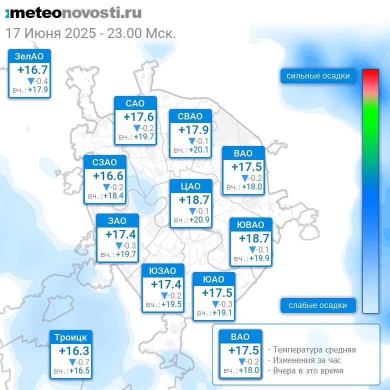 В 23:00 в Москве было от +15.5°C до +19.1°C, средняя температура +17.5°C #погода #Москва #лето #температура #17июня #вторник