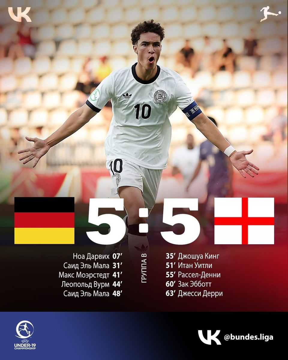 Не то смотрели! Клубный Чемпионат Мира отдыхает 😁 Какие страсти в Румынии, где проходит Чемпионат Европы (U19) среди молодёжных команд. Второй тур. Сборная Германии 🇩🇪 после поражения от Нидерландов в 1 туре (0:3) должна была брать очки в матче с Англией, а лучше вообще победить❗ Со своей задачей молодые немцы справлялись вплоть до 52 минуты. Счёт на табло был 5:1 ... А дальше парни из "Бундестим" знатно расслабились 😡 🔥 С 52 по 63 минуту британцы закинули 4 мяча. Так счёт и остался до конца матча 🏁 У Сборной Германии всего 1 очко перед матчем с Норвегией. Лидер - Нидерланды уже в плей-офф (6), Англия после двух ничьих пока вторая (2). Такие дела! Зато, в отличии от матча "Боруссии Дортмунд" и "Флуминенсе" - здесь было весьма весело 👏