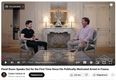 «Неделю назад Такер Карлсон опубликовал интервью со мной о том, что произошло во Франции. Это было освещено СМИ многих стран, за исключением, что интересно, Франции. Ни одна из французских газет не упомянула об этом интервью», — посетовал Дуров