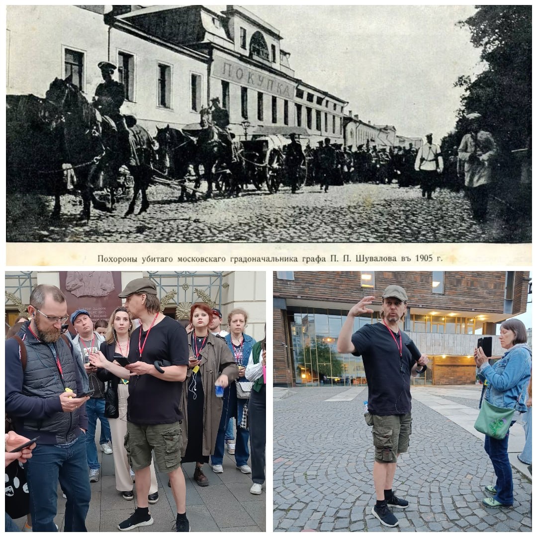 Умер Рабинович, продается "Кадиллак". На верхней фотографии изображены похороны московского градоначальника Павла Шувалова. То, как его в его же собственном кабинете застрелил эсер Куликовский, который потом премило избежал смертной казни, это отдельная история, о которой я сегодня поведал москвичам. Сейчас на месте градоначальника вот эта коричневая громина МХАТА, что у меня за спиной на третьем фото. Но здесь смысл в другом. Процессия идет по Тверскому бульвару мимо дома Юсупова, где тогда располагался антикварный магазин Постникова. И вот эта чудная вывеска вызвала шквал негодования у читателей московской газеты, в которой данный снимок был опубликован. Все уже тогда понимали силу рекламы, и то, что Постников получил такой PR, многих шокировало. P.S. В прошлый раз прекрасная рыжеволосая экскурсантка, что стоит справа от меня, попросила маршрут о террористах. Я выполнил заказ в точности, и сегодня в Москве только о них и рассказывал. По заявкам наших радиослушателей, как говорится