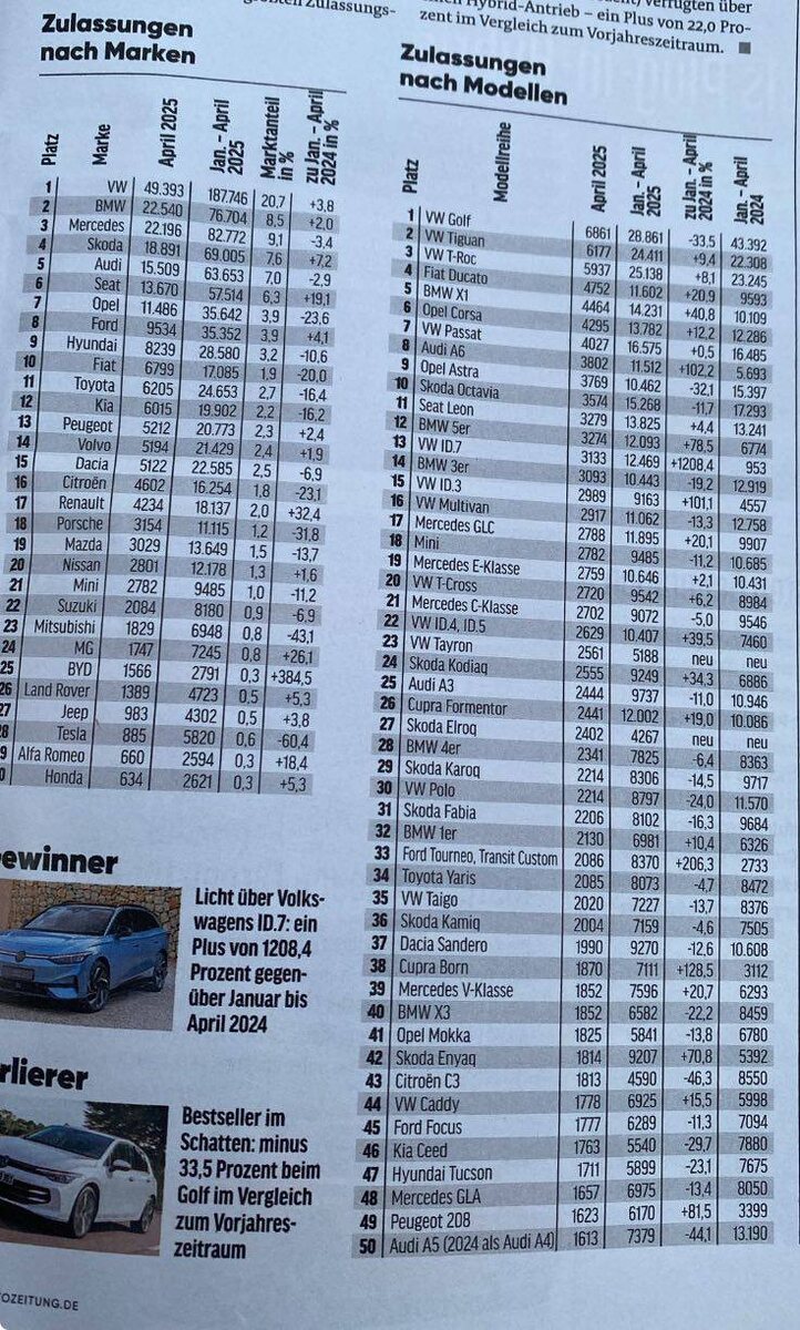 Немного свежей статистики из Германии. Лидеры продаж по моделям: 1. VW Golf — всё ещё №1, но минус -33,5% к прошлому году. 2. VW Tiguan и T-Roc держатся— кроссоверы пока в моде. 3. BMW X1 чувствует себя уверенно Кто в плюсе: – VW ID.7 — +1208%. А недавно шутили, что никто его не видел – Cupra Born — +128,5%. Народ начал догадываться, что это вроде бы как Golf, но на батарейках и позлее. Кто в жестком минусе: – Peugeot 208 — -53,3%. Французам заметно поплохело. – Skoda Fabia, VW Polo — тоже в минусах. Малолитражки все менее интересны. Даже пенсионеры и домохозяйки хотят SUV. Бренды: – VW по-прежнему лидер, но падает. – BMW и Mercedes растут. – BYD — +384%. Не шутка. Китай уже не просто на подходе, он уже у соседа в гараже. Что в итоге: – Электрички продолжают разгон – Китайские бренды зашли серьезно – Компактные хэтчбеки — вчерашний день. – Golf, кажется, потихоньку уходит с пьедестала. Без паники, но с намёком.