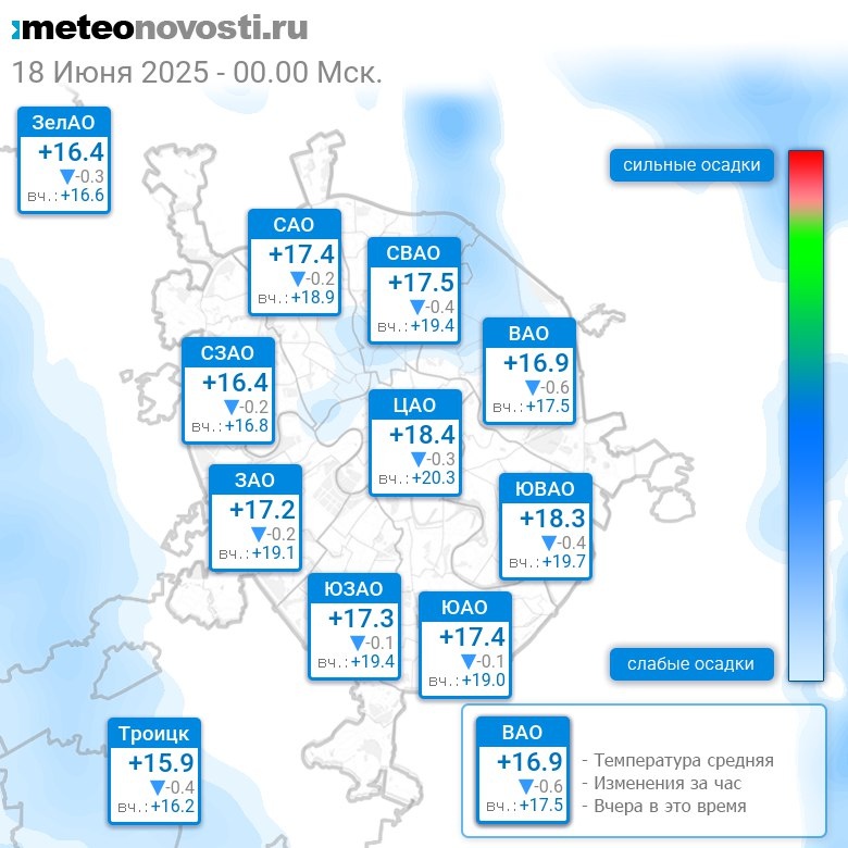 В 0:00 в Москве было от +15.3°C до +19°C, средняя температура +17.2°C #погода #Москва #лето #температура #18июня #среда