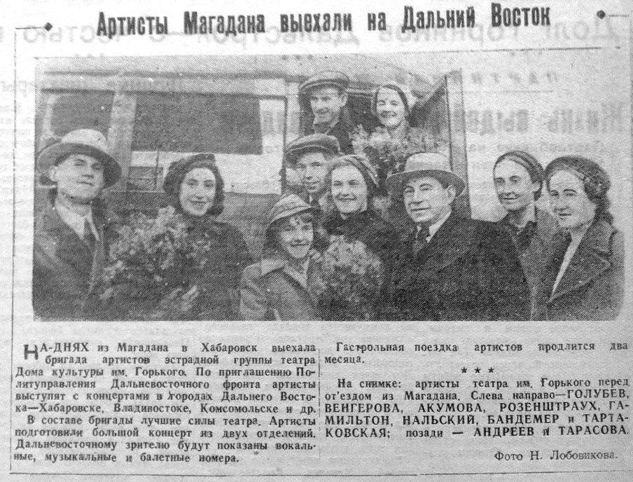 В 1944 году эстрадная группа артистов Магаданского музыкально-драматического театра им. М. Горького выехала на гастроли по российскому Дальнему Востоку. Артисты с большим успехом выступили в Хабаровске, Владивостоке, Уссурийске, Спасске, в штабе Дальневосточного фронта, на кораблях Амурской флотилии, в студии Хабаровского краевого радиокомитета. В общей сложности было дано 55 платных концертов и шесть шефских для воинов Дальневосточного фронта.
