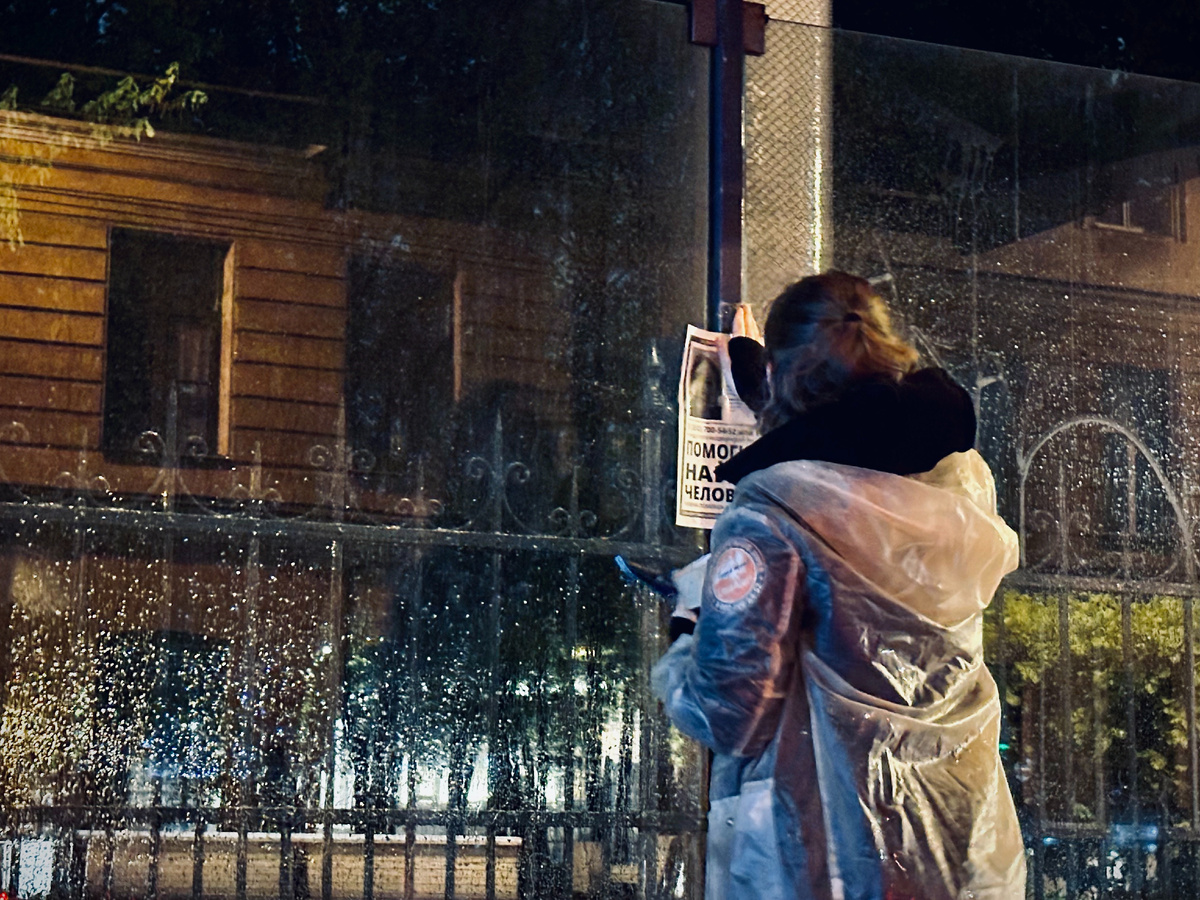 К вечеру координатор принимает решение о выезде. Точка штаба – в самом сердце Петербурга. Начинают собираться поисковики, чтобы затем группа за группой разойтись по задачам. Кто-то осматривает ближайшие дворы и опрашивает сотрудников магазинов, кто-то ездит на автомобиле и расклеивает ориентировки. Ночью на нас обрушивается ливень… Мокнут ориентировки, не хочет клеиться скотч, одежду добровольцев можно выжимать – но никто не сдается, работают до утра.