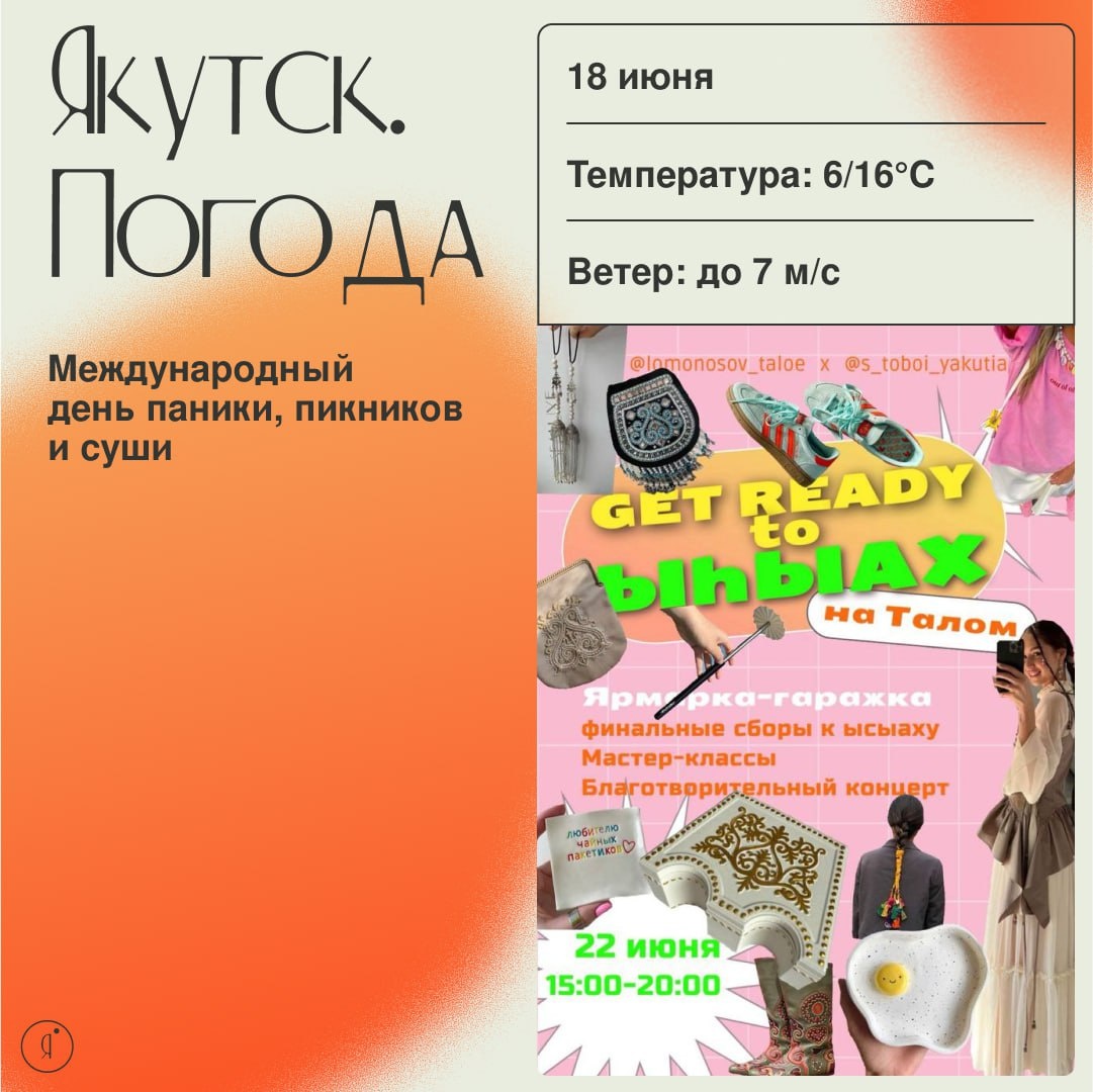 Доброе утро! В каком наряде встретите Ысыах? Если ещё не определились - добро пожаловать на ярмарку «GET READY to ЫСЫАХ»! 🤩 22 июня | 15:00-20:00 Берег Талого озера Вас ждёт: 🤩 Модные наряды и украшения 🤩 Гаражная распродажа 🤩 Живой концерт 🤩 Мастер-классы Хотите стать продавцом? 🤩 +7 914 272-00-07 Online Якутия | Подписаться
