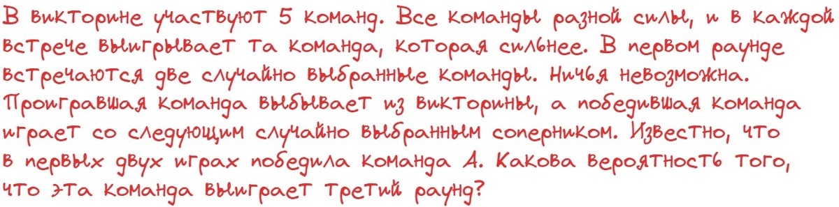 Здравствуйте, уважаемые читатели! Заметил, что многие ребята испытывают трудности при решении задач по вероятности, похожих на задачу ниже. Давайте рассмотрим ее (из задачника по подготовке к ЕГЭ). Некоторые скажут, что задачу можно решить следующим образом. Если команда "А" дошла до третьего раунда, то она в первых двух обыграла некоторые две команды. Тогда в этом третьем раунде с командой "А" может сразиться одна из двух оставшихся команд (всего команд пять, две выбыли и еще есть команда "А"). И вероятность, соответственно, один к двум по определению классической вероятности. Но нет! Так эту задачу решать нельзя. Дело в том, что команды, о которых идет речь в условии, - разной силы (второе предложение). Нельзя сказать, что вероятности выигрыша и проигрыша каждой команды одинаковые. Поэтому здесь нужно применить другой подход. Введем обозначения для удобства. Предположим, что в первых двух раундах команда "А" обыграла команды "Б" и "В" соответственно и тогда в третьем раунде ей предс