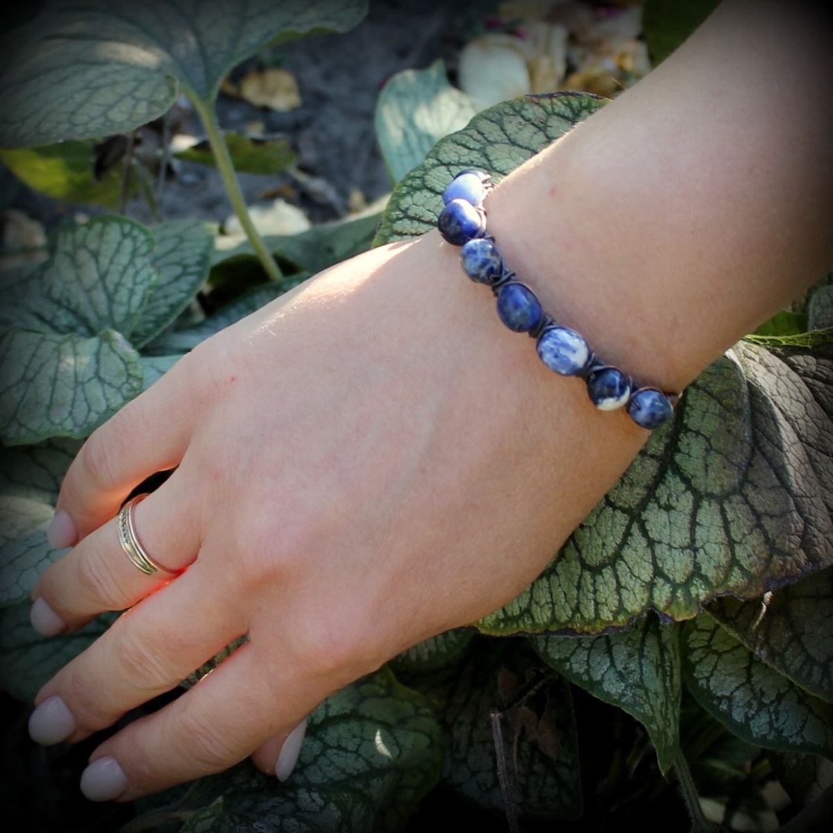 Медный браслет с содалитом роскошного темно-синего цвета с бело-голубыми разводами. Словно росчерки облаков в тёмном небе.