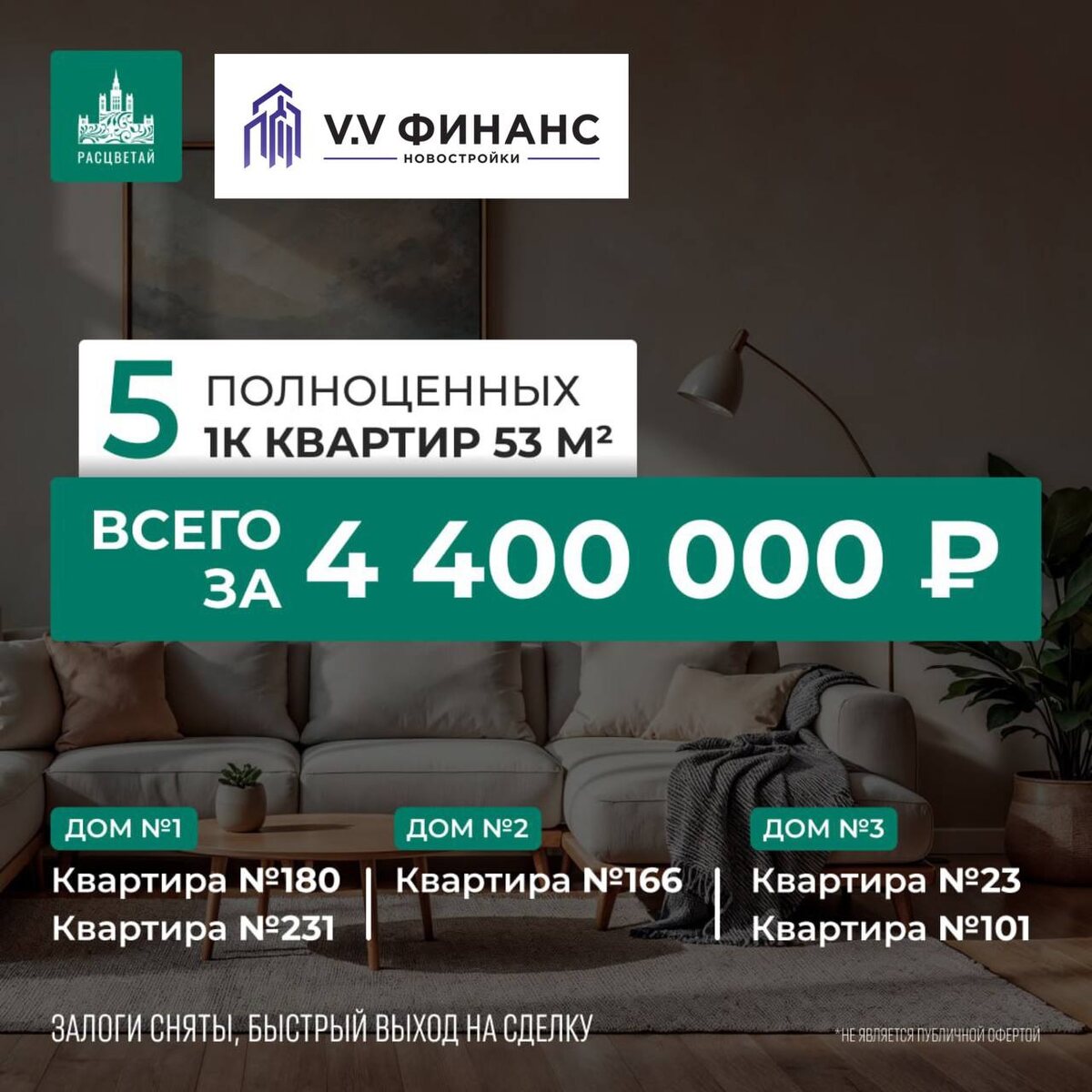 Такое нельзя пропустить🔥 🆕 УНИКАЛЬНОЕ ПРЕДЛОЖЕНИЕ ИЮНЯ Проект от известного застройщика Расцветай. Левый берег. 🤩 5 Полноценных 1к квартир 53 м² ВСЕГО за 4 400 000 ₽ ⚠️ В АКЦИИ УЧАСТВУЕТ 🟢 Дом № 1 - квартиры №180, № 231 🟢 Дом № 2 - квартира № 166 🟢 Дом № 3 - квартиры № 23, № 101