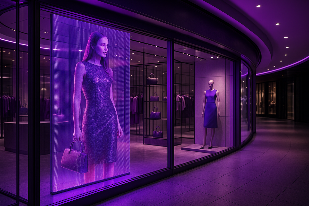 · Магазины одежды и аксессуаров используют прозрачные LED-экраны для показа анимированных коллекций и акций, не закрывая обзор на реальный товар за стеклом.