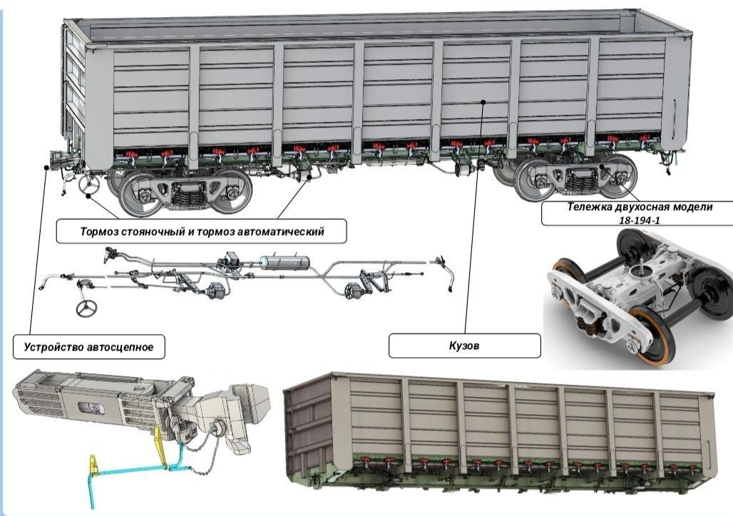 На изображении представлен состав (основные части) полувагона модели 12-196-01 / -02