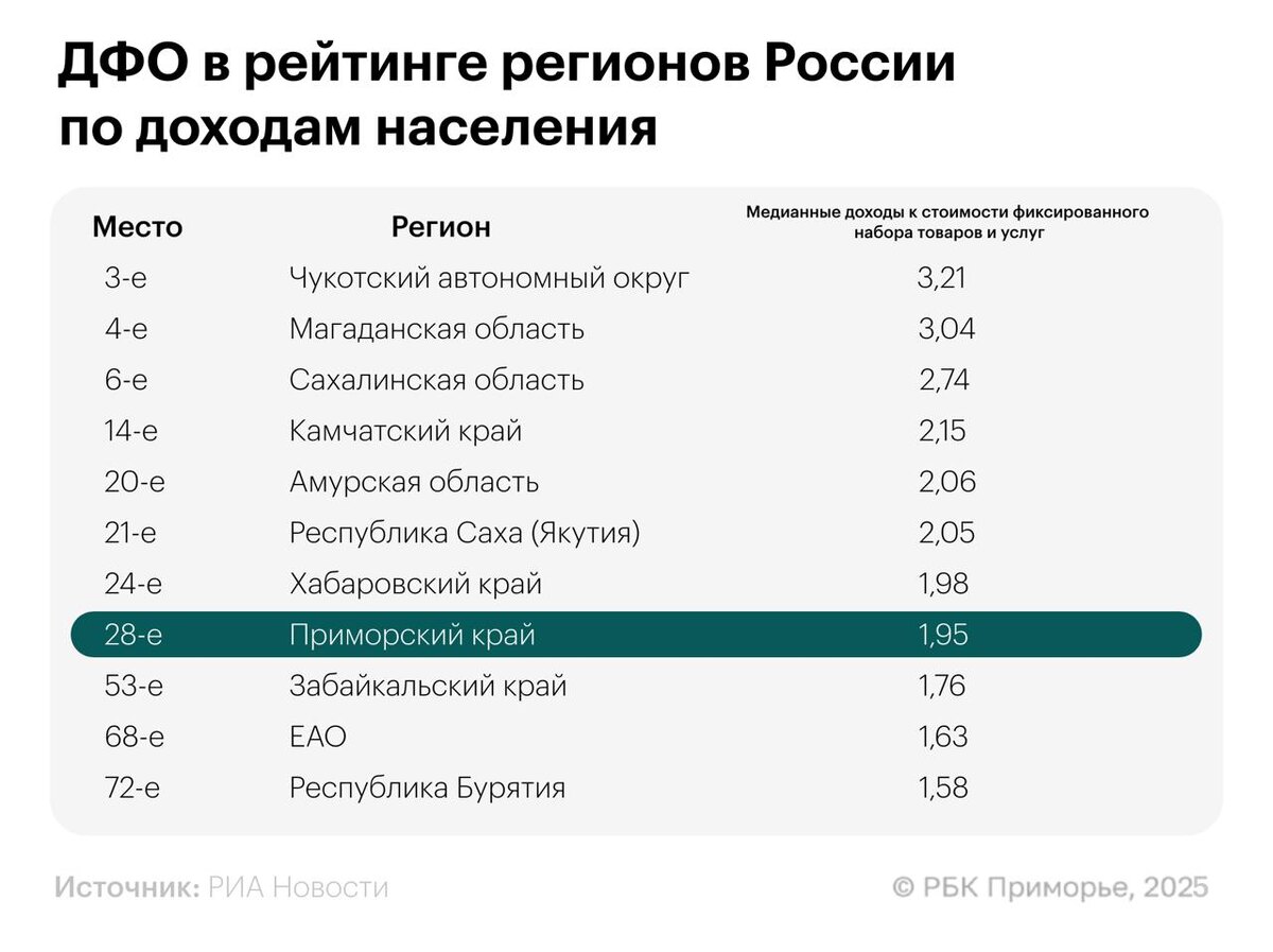 🤑 Чукотка и Колыма обогнали Москву в рейтинге регионов РФ по доходам населения Они заняли третье и четвертое место соответственно. Москва же только пятое. Что касается других регионов Дальнего Востока, то Сахалинская область заняла 6 место в России, Камчатка — 14 место, Амурская область — 20-е, Якутия — 21-е. Приморском крае же только 28 место. В аутсайдерах оказались Забайкалье 53 место, ЕАО — 68-е, и Бурятия — 72-е. 😃Подписывайтесь на РБК Восток