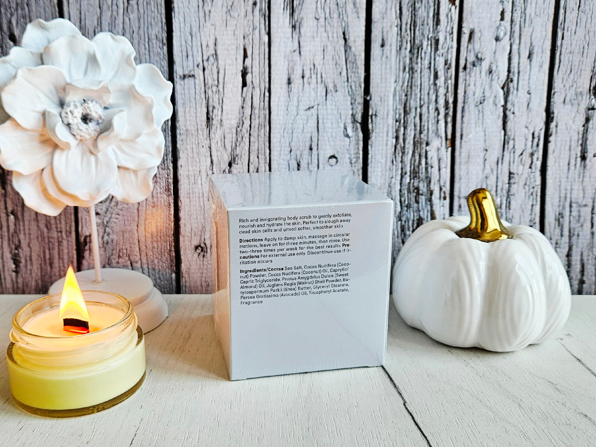 Sea Salt, Cocos Nucifera (Coconut) Powder, Cocos Nucifera (Coconut) Oil, Caprylic/ Capric Triglyceride, Prunus Amygdalus Dulcis (Sweet Almond) Oil, Juglans Regia (Walnut) Shell Powder, Butyrospermum Parkii (Shea) Butter, Glyceryl Stearate, Persea Gratissima (Avocado) Oil, Tocopheryl Acetate, Fragrance