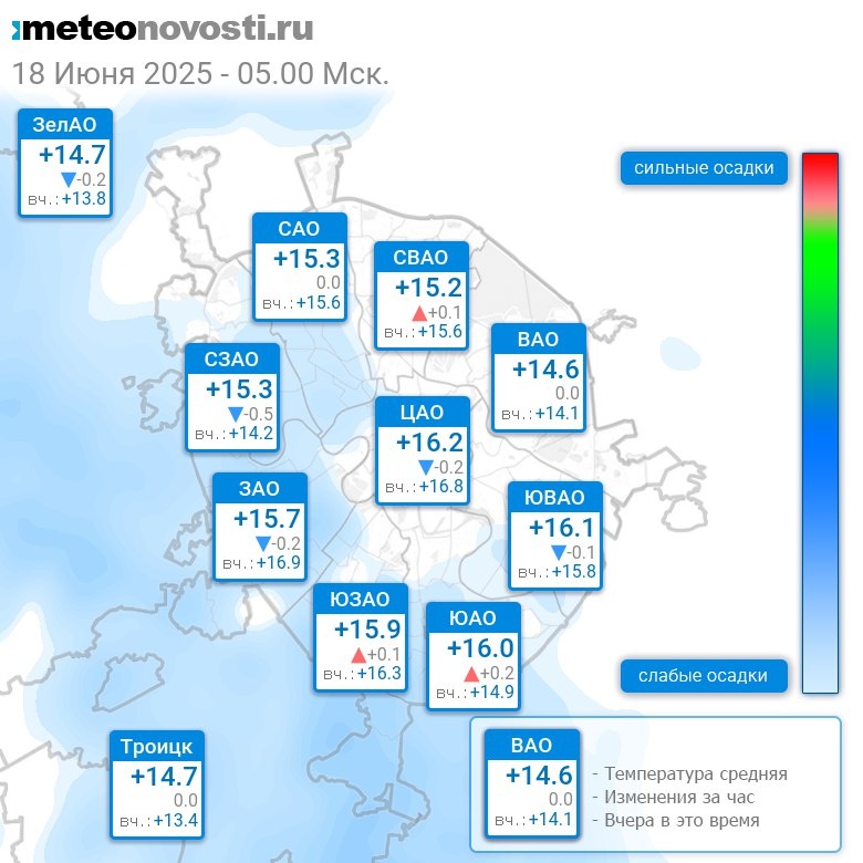 В 5:00 в Москве было от +13.9°C до +16.9°C, средняя температура +15.4°C #погода #Москва #лето #температура #18июня #среда Перейти на сайт Прогноз погоды на 14 дней