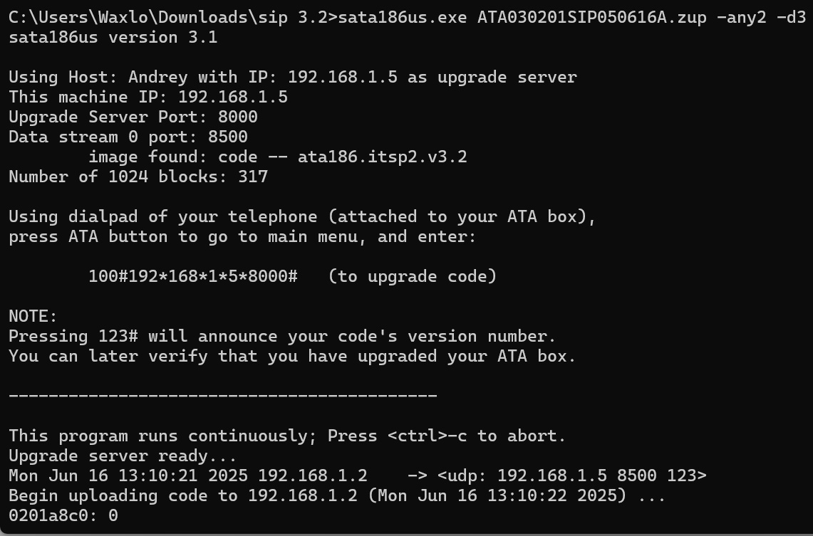 Для обновления прошивки устройства выполняем следующую последовательность действий. 6. Программа выдаст последовательность, которую потребуется ввести на телефоне, например 100#192*168*1*5*8000# 7. Далее на телефоне вводим эту последовательность, после чего начнется процесс обновления прошивки. 8. После обновления в трубке должно прозвучать «UPGRADE SUCCESSFULL» Теперь можно войти по IP-адресу на cisco ata186 и посмотреть в веб-интерфейсе, что прошивка обновилась. Читайте также: Настройка Cisco ATA-186