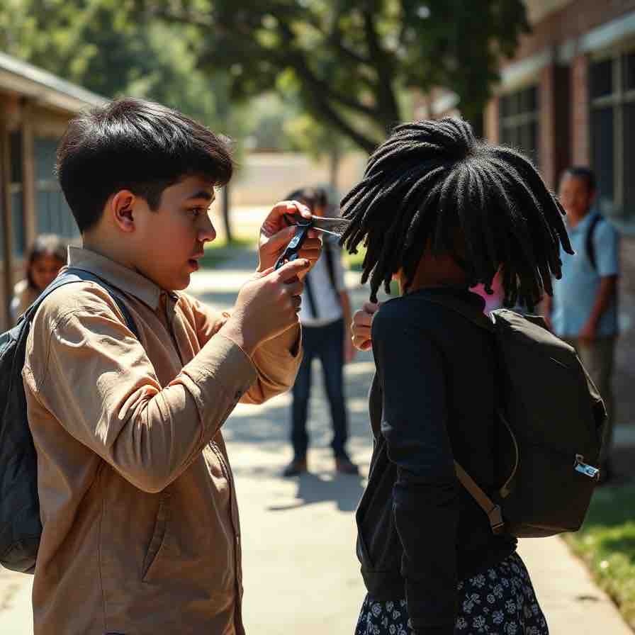 В одном живописном городке, скрытом среди холмов и окружённом широкими полями, жила девочка по имени Амара. Амара была не просто обычной школьницей — она обладала особой харизмой и природной силой, привлекающей к ней к себе окружающих. Её волосы — густые, чёрные и кудрявые — символизировали её африканское наследие и гордость за своё происхождение. Каждый завиток её волос будто говорил о её уникальной истории и её уверенности в себе. Однако в этой самой школе был и мальчик по имени Алекс. Алекса часто переполняли чувства, с которыми он не знал, как справляться: страх, неуверенность и, наконец, зависть. Каждый раз, когда он видел, как Амара уверенно и свободно шагает по коридорам, его окутывала зависть к её непоколебимой уверенности и любви, которую она получала от одноклассников. Однажды, во время перемены, его зависть взяла верх. В тот момент, когда школьный двор был наводнён суетливыми детьми, он сделал то, что немногим пришло бы в голову. Он подобрался поближе к Амаре, когда она от