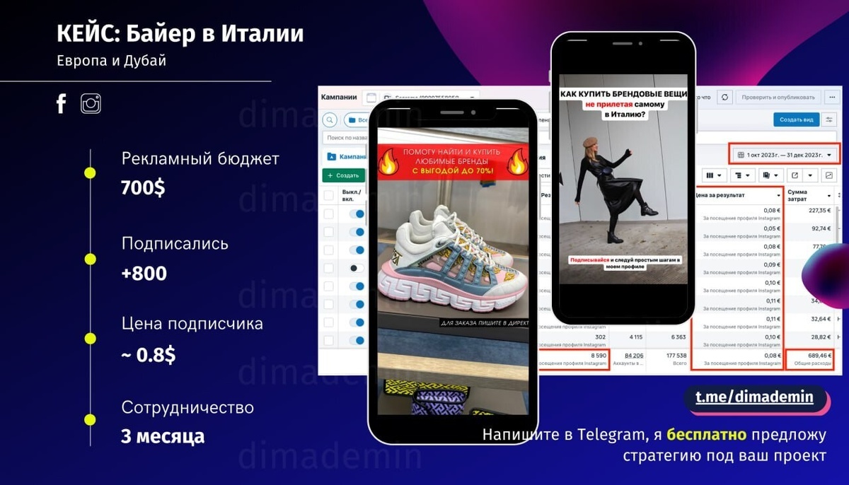 🔥Освоил более 15.000.000 Р рекламного бюджета со средней окупаемостью ~250%. Итак, эта статья — мой реальный кейс. Перейдем к деталям👇 Ко мне обратилась Диана с запросом настроить таргетированную рекламу в Instagram, чтобы приводить целевых подписчиков в ее экспертный блог Байера. Диана проживает в Италии и помогает с шоппинго