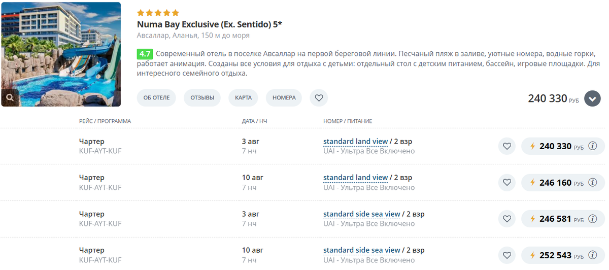 Стоимость тура в августе на 2-х взрослых, 7 ночей, питание "Ультра все включено", вылет из Самары - от 120 165 р/ч.