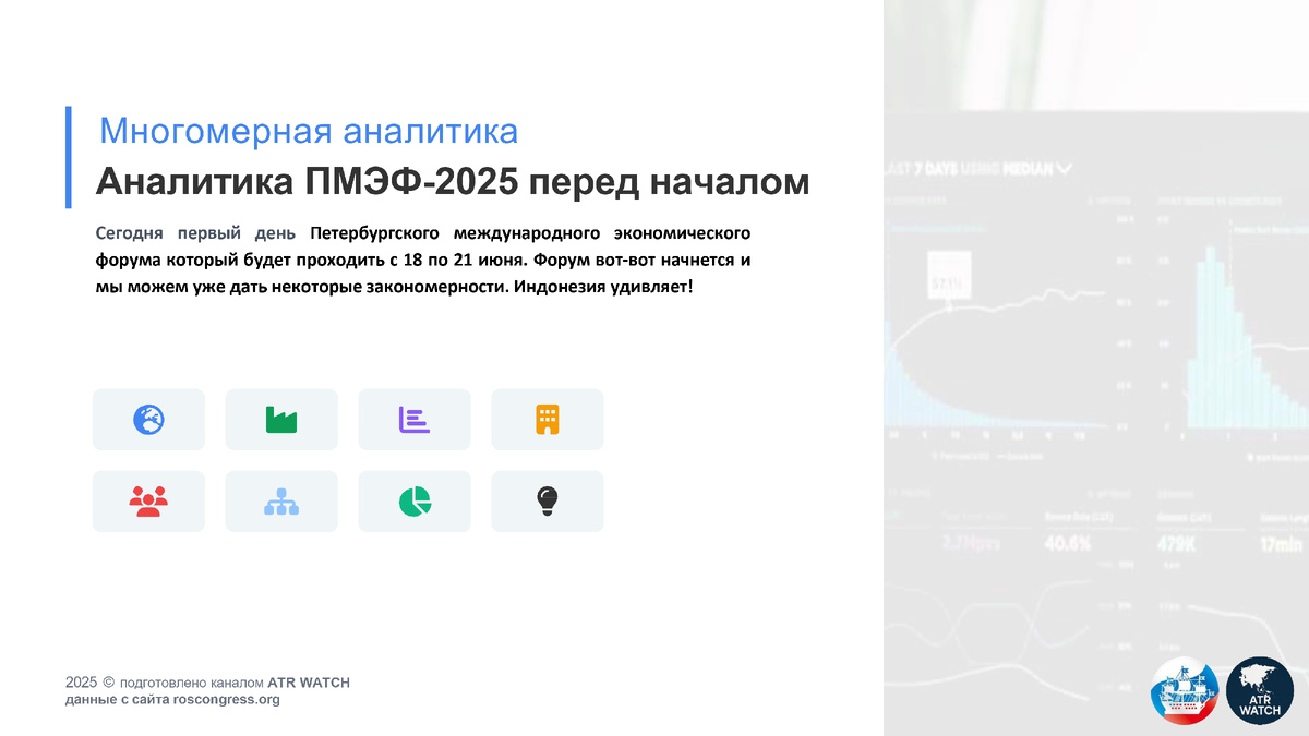 По мимо строительной тематики на данном канале, мы стараемся также следить за основными тенденциями и событиями в России. В дальнейшем возможно все это выльется в отдельный канал ATR Watch. Петербургский международный экономический форум — важнейшее деловое событие в России, проходящее с 1997 года. В 2025 году форум состоится с 18 по 21 июня под темой «Общие ценности — основа роста в многополярном мире». Программа включает десятки панелей и встреч, значимых для фондового рынка и российской экономики. День 1 (18 июня): энергия, инфраструктура, технологии Первый день сфокусирован на глобальной энергетике, включая поставки в страны Юга, развитие Северного морского пути и цифровые платформы. День 2 (19 июня): промышленность, ИИ, финансы Будут обсуждаться машиностроение, кибербезопасность, цифровые валюты и развитие ИИ. Особый интерес вызывает конференция о перспективах искусственного интеллекта в РФ. День 3 (20 июня): автопром, фондовый рынок, финтех .Обсудят развитие отечественного автопр