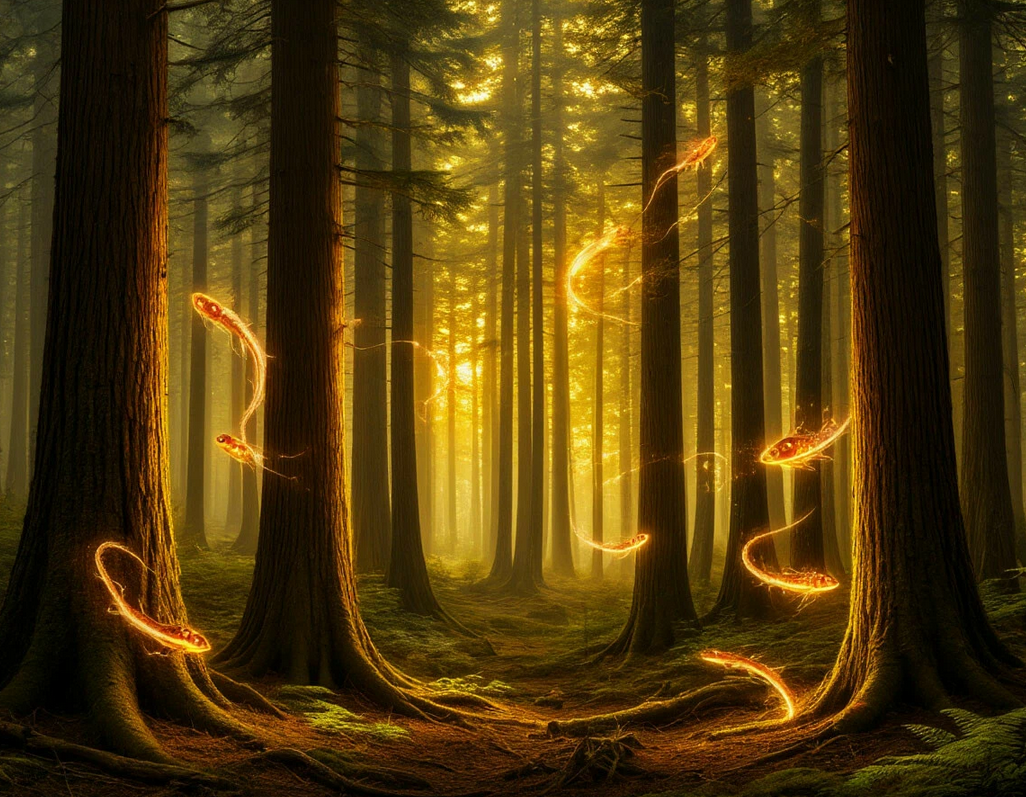 Осторожно ступая через лес, неожиданно для себя путники осознали, что земля под ногами светится и переливается. Да и не только земля. Всё вокруг было охвачено ярко жёлтым светом.