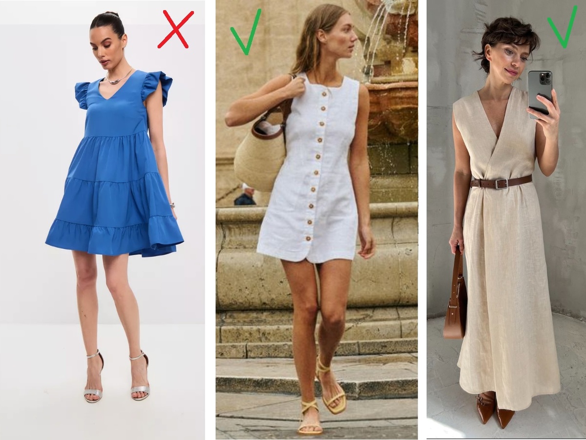 Я чаще всего показываю современные вещи и готовые образы, однако важно знать и что уже устарело. Сеголня статья для тренировки вашей насмотренности с примерами ошибок в летних образах, которые я до сих пор замечаю. Также для большей пользы покажу, что и как надеть вместо этого. Ярусное платье, оно же платье - парашют. Такие платья были в тренде 5 лет назад, но буквально один сезон - они мало кого украшают, поскольку прилично так накидывают килограммов визуально. Это же еще и с рукавами с воланчиками - антитрендовое комбо. Здесь помимо неактуального платье есть еще ошибка: платье в длине мини, да еще и с декольте и дополнено обувью на каблуках - это явный перебор. Если хочется мини, то лучше с закрытым верхом и обувью на плоском ходу или небольшом каблучке. Ели хочется декольте, то брем платье в длине миди или макси. Но это, конечно, не про то, что так именно сейчас не носят, а о базовых правилах. Платье - футляр. Тесненькое, с рукавом невнятной длины (да, не только 3/4 - зло) с вырезом
