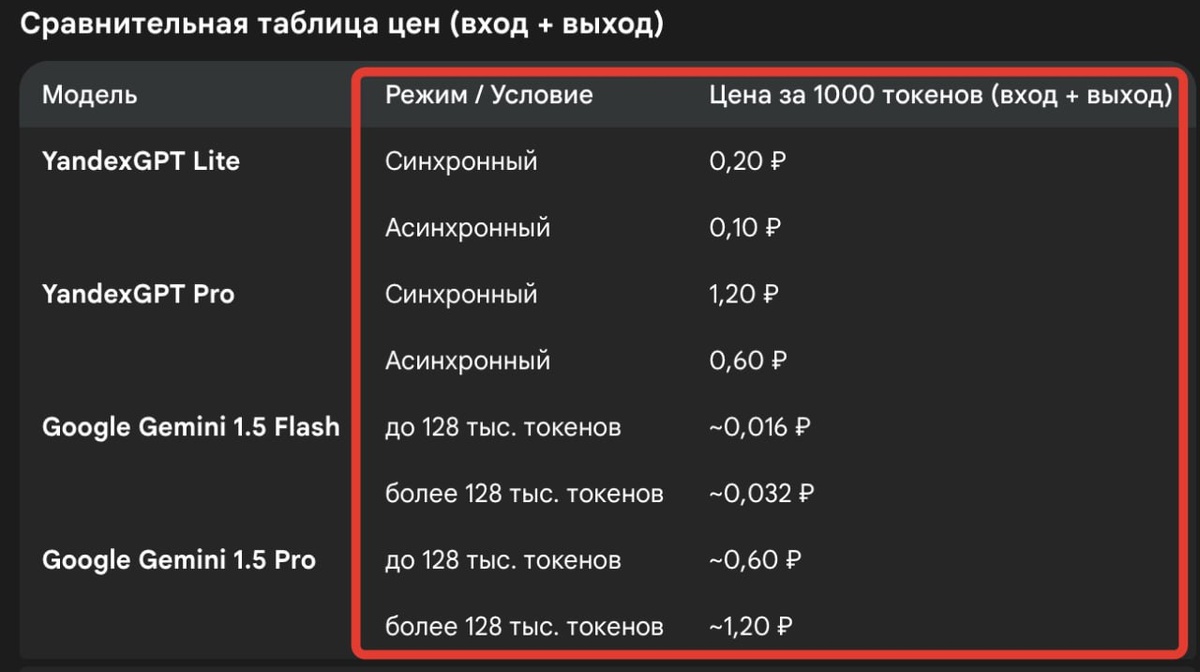 Ради интереса сравнил стоимость ИИ от Yandex и Google. Если брать модели высокого уровня, то цена плюс- минус схожая, но если сравнивать более простые модели, то Yandex просит в 10 раз больше денежек :) Курс 1 к 85. Я тут правда еще до конца не понимаю что такое синхронный и асинхронный применительно к Google... Вывод? Ну для простых задач выгоднее Google, а для более серьезных, судя по табличке, разницы нет. Русский ИТ бизнес